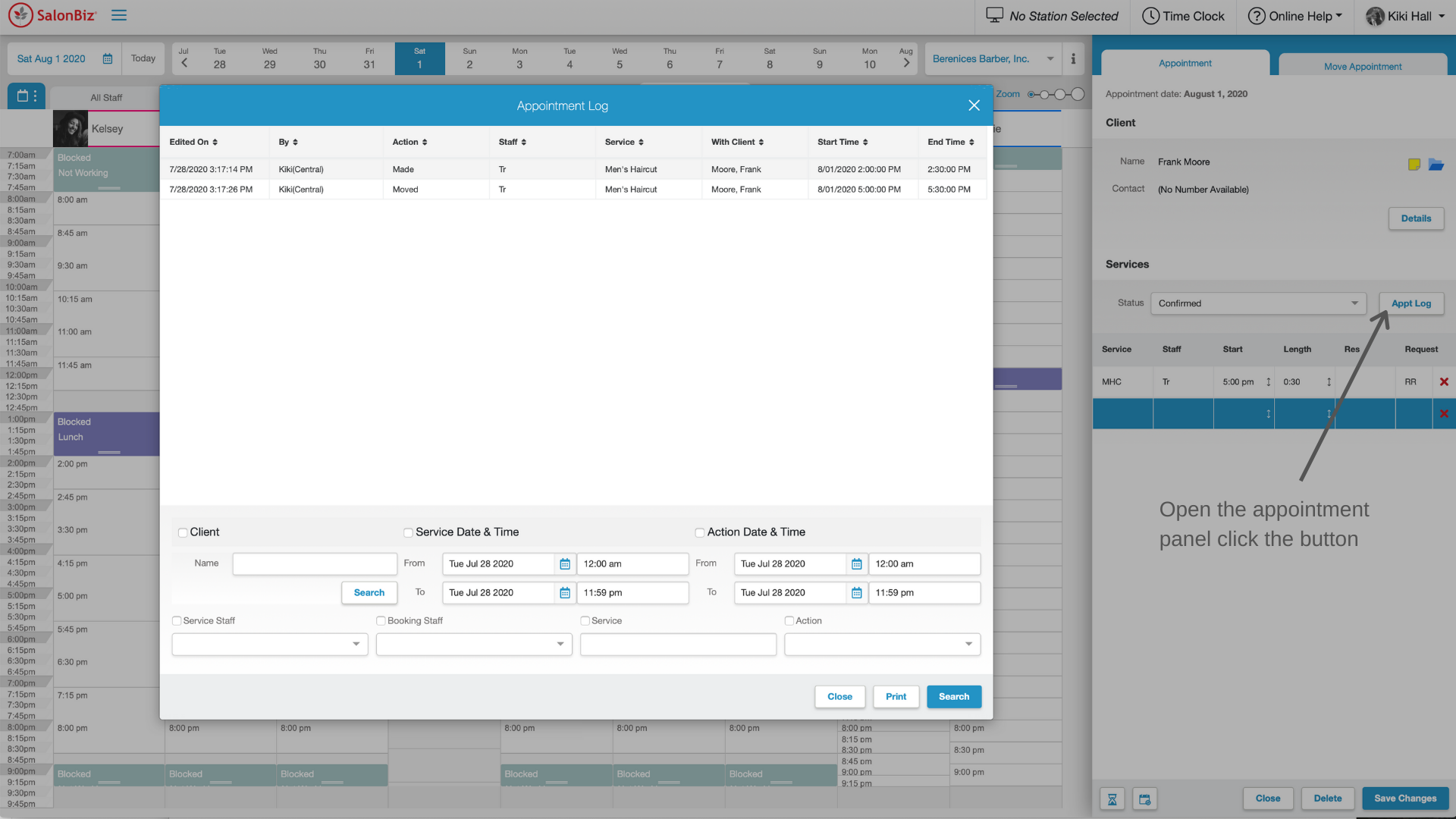 To see who booked an appointment (or any other action on an appointment), click the Appt Log button in the appointment panel. This will open the Appointment Log, and it will be automatically filtered to show you the actions for that specific appointment.